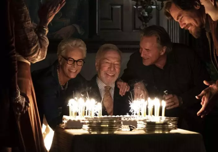 This image released by Lionsgate shows Jamie Lee Curtis, from left, Christopher Plummer, Don Johnson and Michael Shannon in a scene from "Knives Out." (Claire FolgerLionsgate via AP)