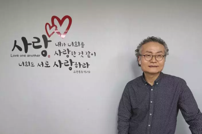 In this Nov. 1, 2019, photo, Shim Yang-sup, the principal of the Seoul-based alternative South-North Love School, speaks during an interview at his school in Seoul, South Korea. Hundreds of children born to North Korean women and Chinese men have resettled in South Korea, but life is often tough. The sign reads "Love one another as I love you." Shim said the children should be supported because they represent an untapped resource, with the ability to often speak two languages and navigate both Korean and Chinese cultures.(AP PhotoAhn Young-joon)