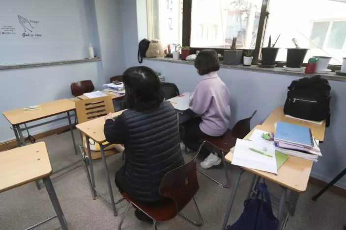 In this Nov. 1, 2019, photo, 20 years old student Choe, right, born to a North Korean refugee mother and a Chinese father, and her North Korean mother Choe H.Y. sit during an interview at the South-North Love School in Seoul, South Korea. Hundreds of children born to North Korean women and Chinese men have resettled in South Korea, but life is often tough. They didn't want their full names and faces to be revealed because of worries that media publicity could hurt their life in South Korea. (AP PhotoAhn Young-joon)