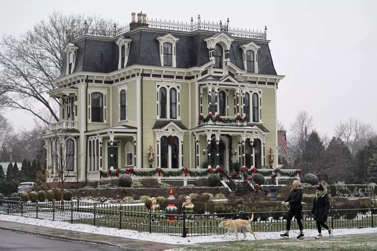 People walk by the Silas W Robbins B & B in Wethersfield, Conn., Saturday, Dec. 6, 2025, where parts of the Hallmark film "Christmas on Honeysuckle Lane" was filmed. (AP Photo/Jessica Hill)