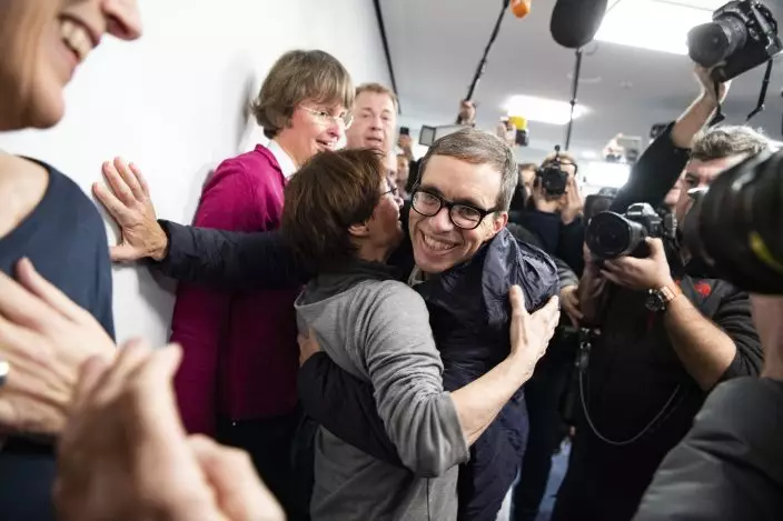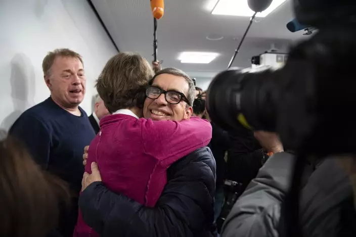 German Jens Soering, center, is embraced by Bernadette Faber after his arrival at the Frankfurt Airport in Frankfurt, Germany, Tuesday, Dec. 17, 2019. The son of a German diplomat, who served more than 33 years in prison for a murder in Virginia he has steadfastly maintained he did not commit, arrived in Frankfurt Tuesday after being released on parole. (Andreas Arnolddpa via AP)
