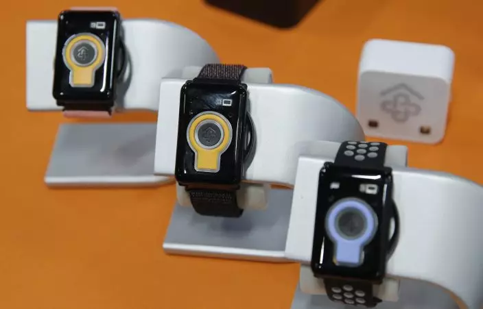 The CarePredict Tempo Series 3 appears on display at the CarePredict booth during CES Unveiled before CES International, Sunday, Jan. 5, 2020, in Las Vegas. The wearable device for seniors detects changes in the senior's activity and can alert caregivers and family via an app. (AP PhotoJohn Locher)