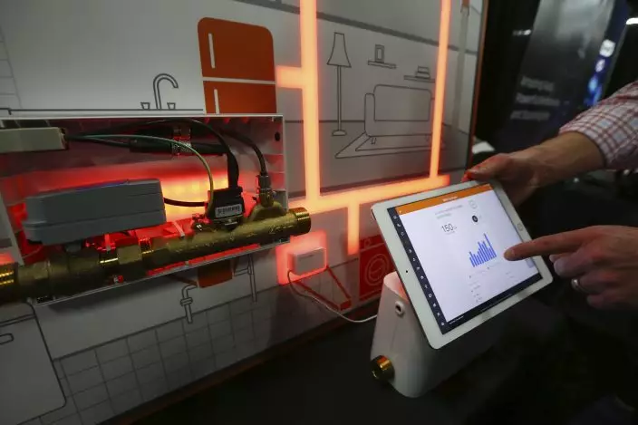 The Alarm.com water management smart water valve is shown here with the app at the CES Unveiled media preview event, Sunday, Jan. 5, 2020, in Las Vegas. (AP PhotoRoss D. Franklin)