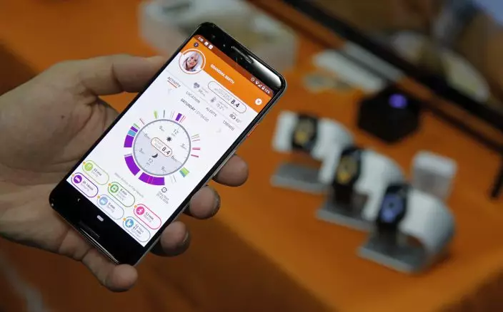 The app for the CarePredict Tempo Series 3 appears on display at the CarePredict booth during CES Unveiled before CES International, Sunday, Jan. 5, 2020, in Las Vegas. The wearable device for seniors detects changes in the senior's activity and can alert caregivers and family. (AP PhotoJohn Locher)