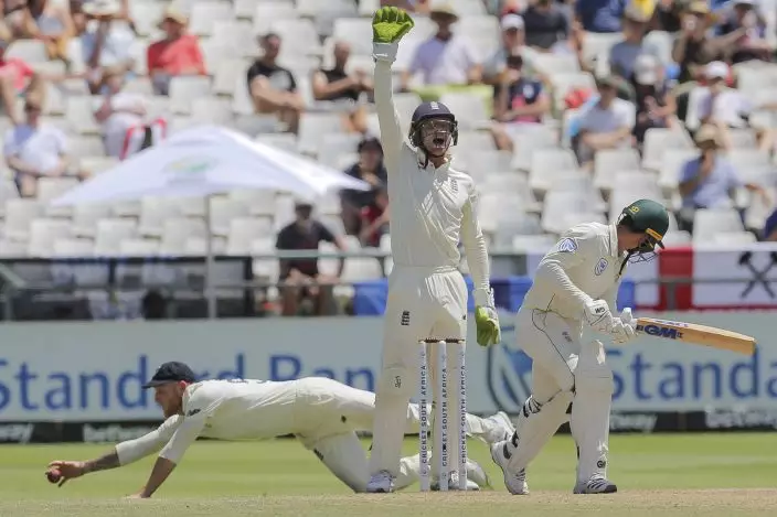 England's wicketkeeper Jos Buttler appeals the wicket of South Africa's Quinton De Kock while Ben Stokes fields the ball during day five of the second cricket test between South Africa and England at the Newlands Cricket Stadium in Cape Town, South Africa, Tuesday Jan. 7, 2020. (AP PhotoHalden Krog)