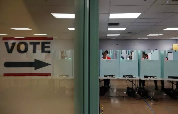 FILE - In this Nov. 6, 2018, file photo, people vote at a polling place in Las Vegas. State election officials in at least two dozen states, including Nevada, have seen suspicious cyber activity in the first half of January 2020, although it’s unclear who was behind the efforts and no major problems were reported. (AP PhotoJohn Locher, File)