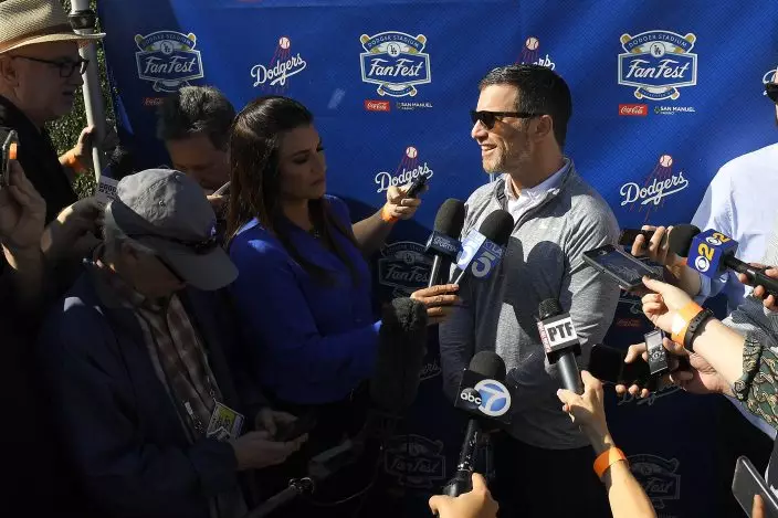 Los Angeles Dodgers president of baseball operations, Andrew Friedman, is interviewed by reporters during Dodger Stadium FanFest Saturday, Jan. 25, 2020, in Los Angeles. (AP PhotoMark J. Terrill)