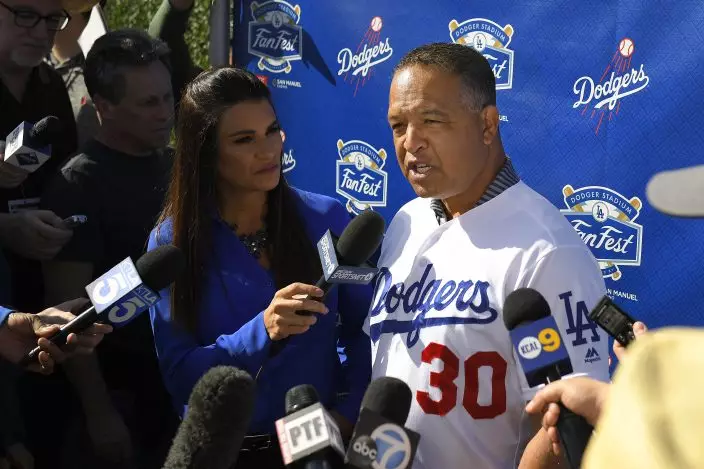 Los Angeles Dodgers manager Dave Roberts is interviewed by reporters during Dodger Stadium FanFest Saturday, Jan. 25, 2020, in Los Angeles. (AP PhotoMark J. Terrill)