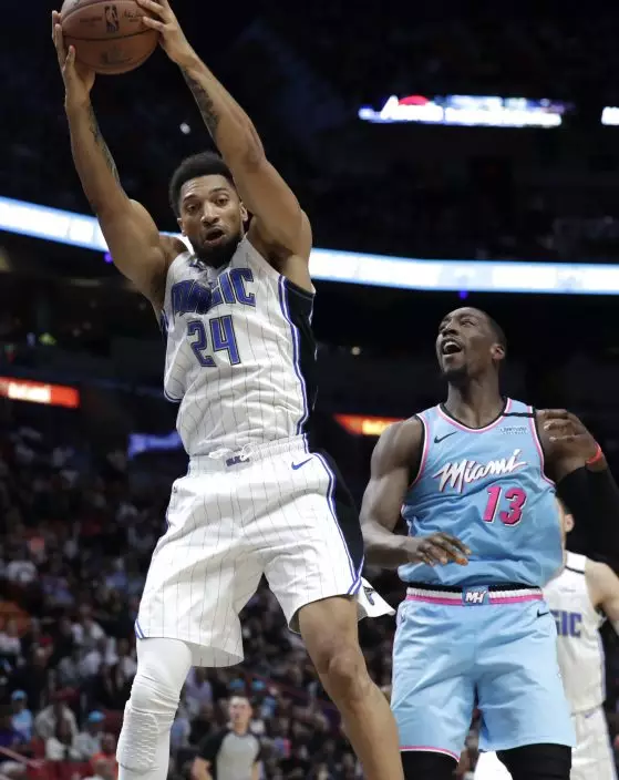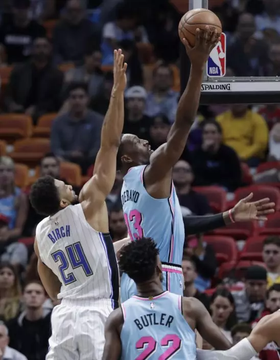 Orlando Magic center Khem Birch (24) gets a rebound over Miami Heat forward Bam Adebayo (13) during the first half of an NBA basketball game, Monday, Jan. 27, 2020, in Miami. (AP PhotoLynne Sladky)