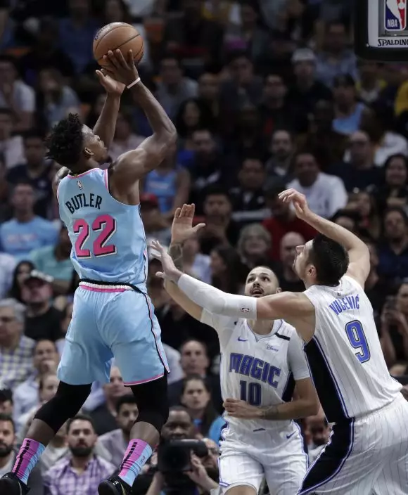 Miami Heat forward Jimmy Butler (22) shoots as Orlando Magic guard Evan Fournier (10) and center Nikola Vucevic (9) defend during the first half of an NBA basketball game, Monday, Jan. 27, 2020, in Miami. (AP PhotoLynne Sladky)