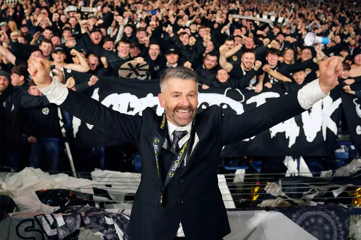 St Mirren manager Stephen Robinson celebrates after the final whistle of the Scottish Premier Sports Cup final against Celtic, in Glasgow, Scotland, Sunday, Dec. 14, 2025. (Jane Barlow/PA via AP)