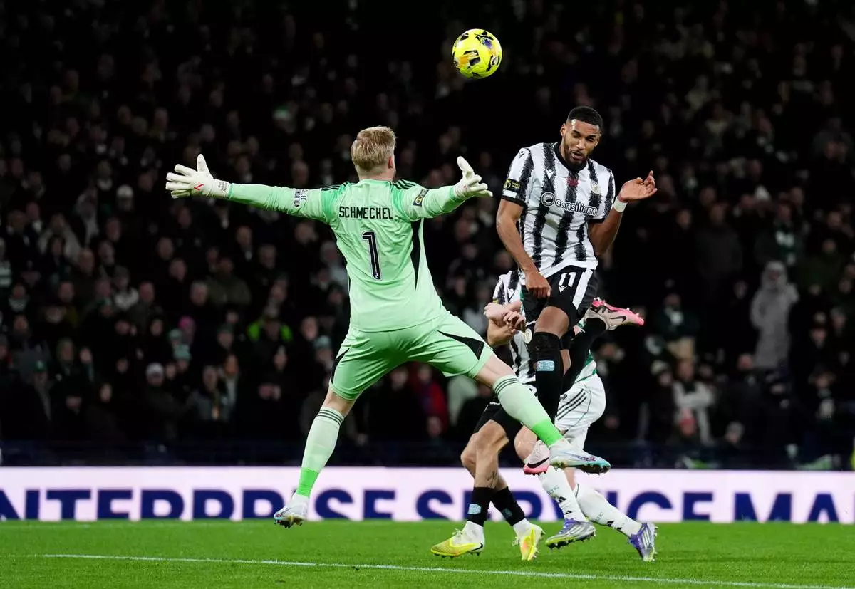 St Mirren's Jonah Ayunga, right,heads the ball over Celtic goalkeeper Kasper Schmeichel to score his side's second goal, during the Scottish Premier Sports Cup final, in Glasgow, Scotland, Sunday, Dec. 14, 2025. (Andrew Milligan/PA via AP)