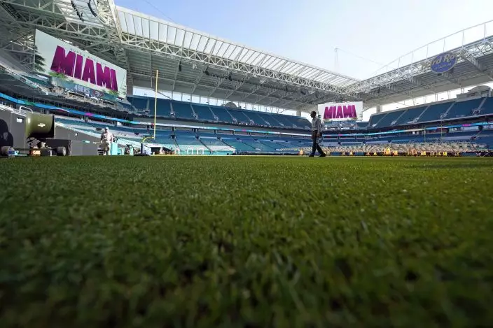 The grass inside Hard Rock Stadium is shown Tuesday, Jan. 28, 2020, in Miami Gardens, Fla., in preparation for the NFL Super Bowl 54 football game. (AP PhotoDavid J. Phillip)
