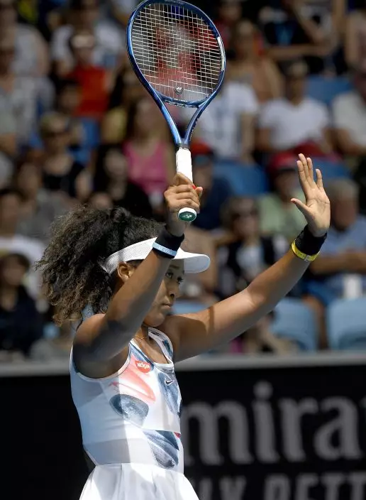 In this Jan. 22, 2020 photo, Japan's Naomi Osaka gestures to her opponent China's Saisai Zheng after her shot hit the net during their second round match at the Australian Open tennis championship in Melbourne, Australia. It might just be the most insincere gesture in sports: A tennis player signals an apology after a ball clips the net tape and trickles over, producing a winner, an obviously accidental winner, to end a point. (AP PhotoAndy Brownbill)