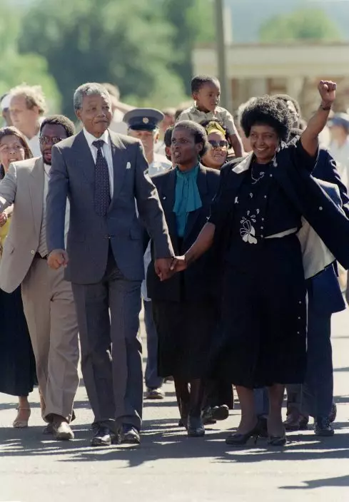 FILE - In this Feb. 13, 1990 file photo, Nelson Mandela and his wife, Winnie Madikizela-Mandela, gesture as they arrive at Soccer City Stadium in Soweto, South Africa two days after after being released after serving 27 years in prison. Mandela's release set off joyous celebrations and violent clashes as supporters welcomed Mandela back from years in jail. (AP PhotoUdo Weitz, File)