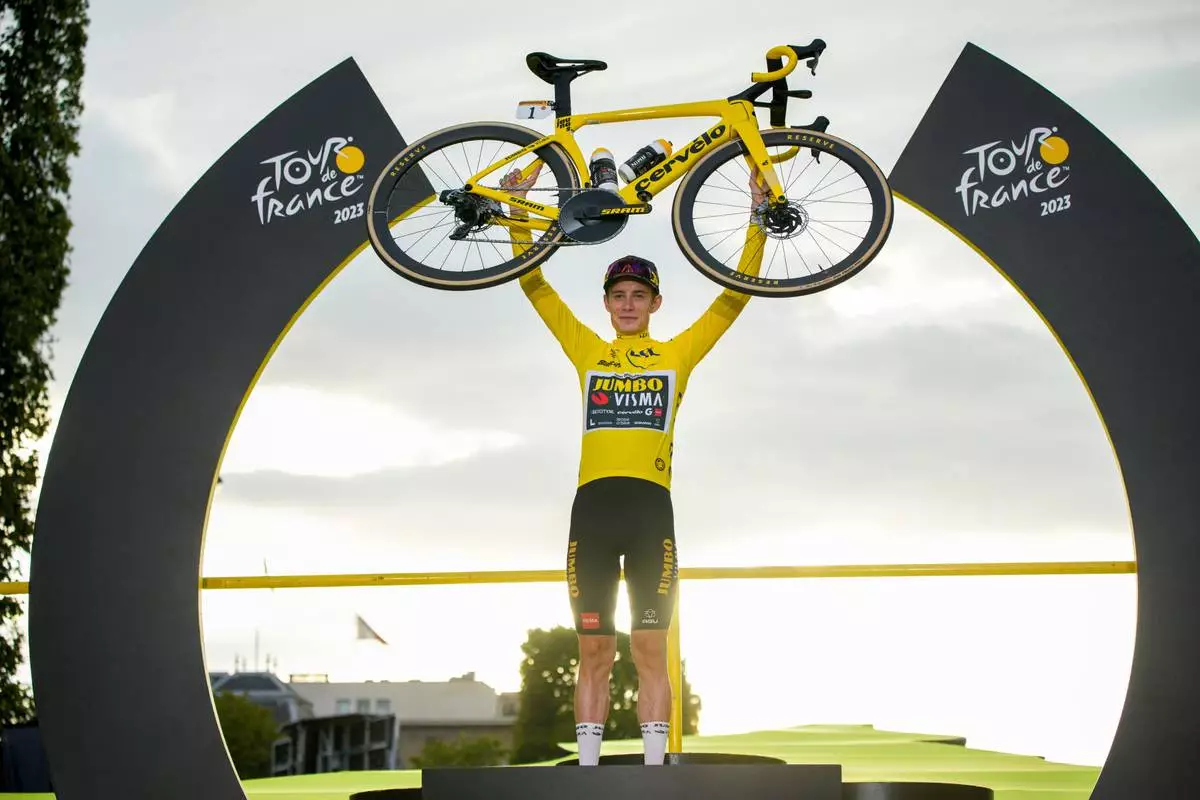 FILE - Tour de France winner Denmark's Jonas Vingegaard, wearing the overall leader's yellow jersey, celebrates on the podium after the last stage of the Tour de France cycling race in Paris, France, Sunday, July 23, 2023. (AP Photo/Daniel Cole, file)
