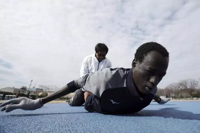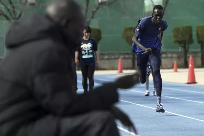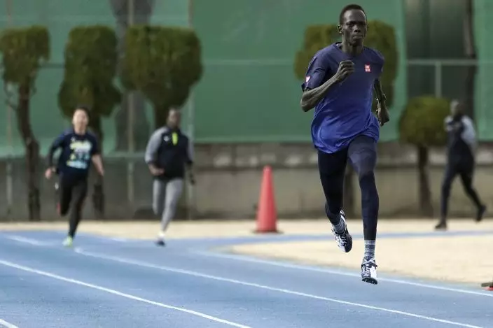 In this Feb. 12, 2020 photo, Abraham Majok, a South Sudanese 1500m runner, trains practice with Japanese volunteers during training for the Tokyo 2020 Olympics in Maebashi, Gunma Prefecture, north of Tokyo. Four South Sudanese athletes are already training in Japan for the Olympics. They are getting a head start. And although they aren't likely to win any medals they will be ahead of most of the other 11,000 athletes who will be in Tokyo this summer for the Olympics. (AP PhotoEugene Hoshiko)