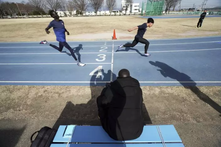 In this Feb. 12, 2020, photo, Joseph Akoon Akoon, of the South Sudan team practices as coach Joseph Omirok, marks time of runs during their training ifor the Tokyo 2020 Olympics and Paralympics in Maebashi, Gunma Prefecture, north of Tokyo. (AP PhotoEugene Hoshiko)