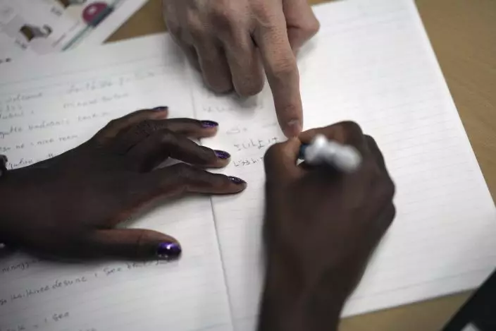 In this Feb. 12, 2020, photo, 100m sprinter Lucia Moris, bottom, of the South Sudan team practices the Japanese language as part of their training for the Tokyo 2020 Olympics and Paralympics in Maebashi, Gunma Prefecture, north of Tokyo. Four South Sudanese athletes are already training in Japan for the Olympics. They are getting a head start. And although they aren't likely to win any medals they will be ahead of most of the other 11,000 athletes who will be in Tokyo this summer for the Olympics. (AP PhotoEugene Hoshiko)