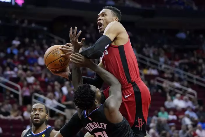 Houston Rockets' Russell Westbrook reacts after being fouled during the second half of an NBA basketball game against the Los Angeles Clippers Thursday, March 5, 2020, in Houston. The Clippers won 120-105. (AP PhotoDavid J. Phillip)