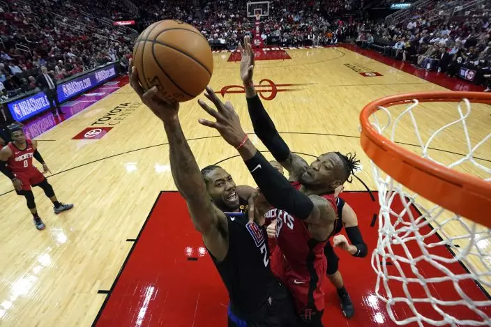 Los Angeles Clippers' Kawhi Leonard (2) goes up for a shot as Houston Rockets' Robert Covington defends during the second half of an NBA basketball game Thursday, March 5, 2020, in Houston. (AP PhotoDavid J. Phillip)