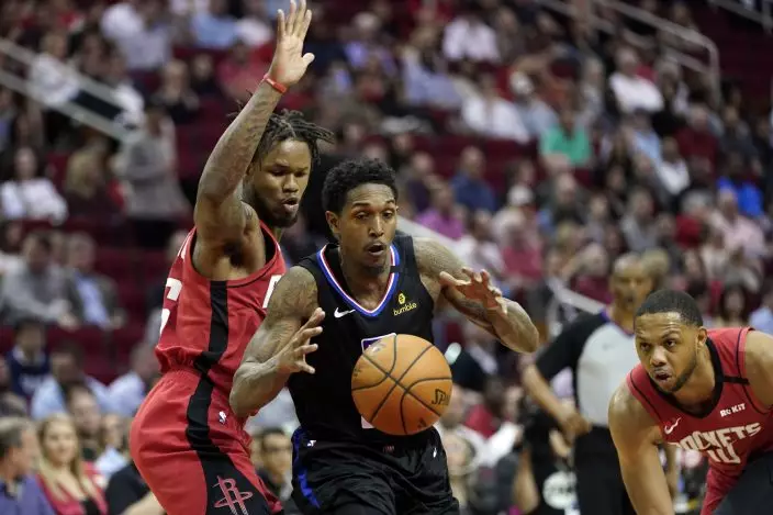 Los Angeles Clippers' Lou Williams, center, reaches for the ball as Houston Rockets' Ben McLemore, left, and Eric Gordon, right, defend during the first half of an NBA basketball game Thursday, March 5, 2020, in Houston. (AP PhotoDavid J. Phillip)