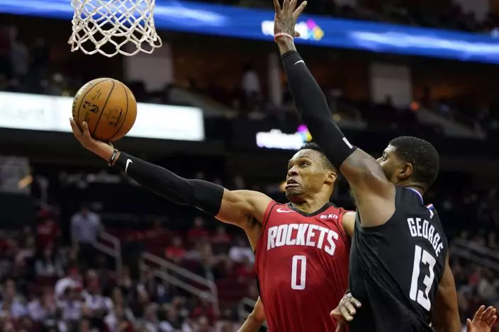 Houston Rockets' Russell Westbrook (0) goes up for a shot as Los Angeles Clippers' Paul George (13) defends during the second half of an NBA basketball game Thursday, March 5, 2020, in Houston. The Clippers won 120-105. (AP PhotoDavid J. Phillip)