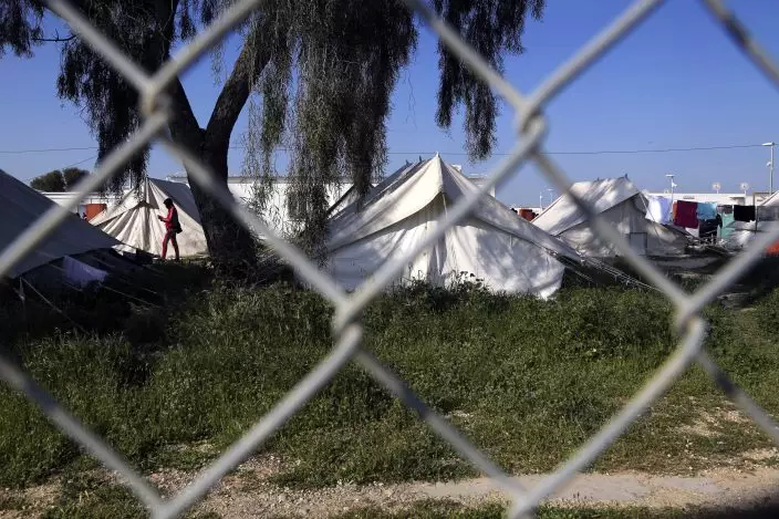 A migrant walks by the tents inside a refugee camp in Kokkinotrimithia outside of Nicosia, Cyprus, Tuesday, March 3, 2020. The government of ethnically divided Cyprus is ramping up measures to stem migrant inflows amid fears of a surge of new arrivals following Turkey's decision to open its borders to those seeking to enter Europe illegally. (AP PhotoPetros Karadjias)