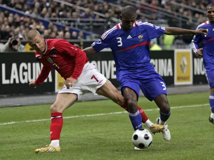 FILE - In this Wednesday, March 26, 2008 file photo England's David Beckham, left, challenges for the ball with France's Eric Abidal during their friendly international soccer match at Stade de France stadium in Saint Denis, outskirts of Paris, Wednesday, March 26, 2008. On this day 12 years ago David Beckham won his 100th cap for England. The midfielder, playing at the time for LA Galaxy, played 63 minutes in a 1-0 friendly defeat to France at the Stade de France. (AP PhotoFrancois Mori, File)