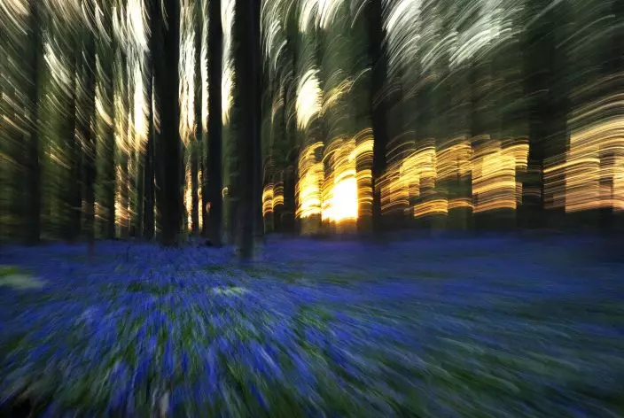 In this zoom effect with slow shutter speed, Bluebells, also known as wild Hyacinth, bloom in the Hallerbos forest in Halle, Belgium, on Thursday, April 16, 2020. Bluebells are particularly associated with ancient woodland where it can dominate the forest floor to produce carpets of violet–blue flowers. (AP PhotoVirginia Mayo)