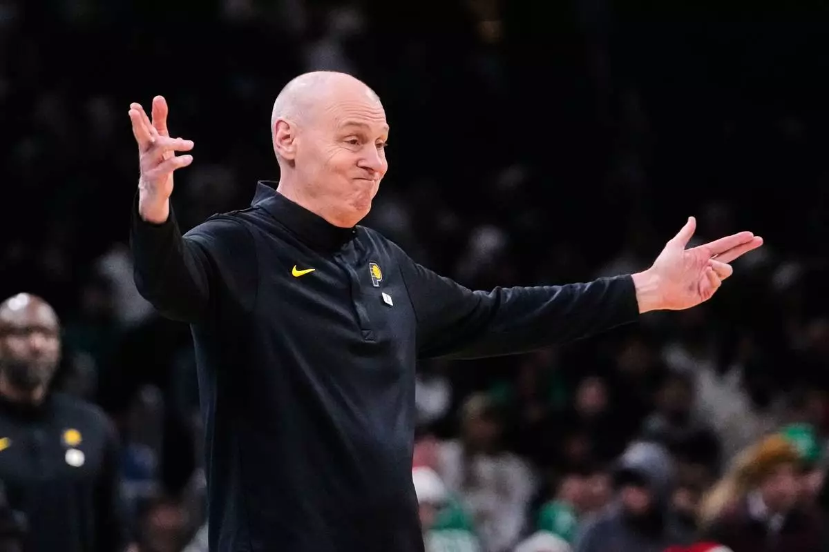 Indiana Pacers head coach Rick Carlisle reacts to a call during the first half of an NBA basketball game against the Boston Celtics, Monday, Dec. 22, 2025, in Boston. (AP Photo/Charles Krupa)