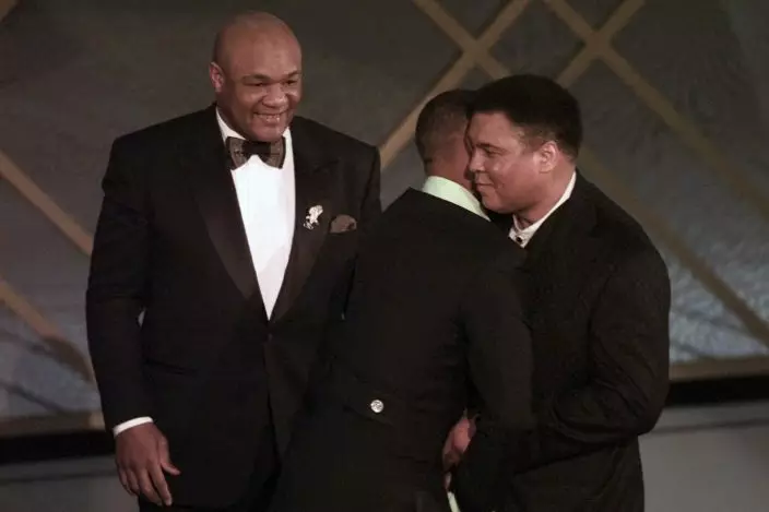 FILE - In this March 24, 1997, file photo, George Foreman, left, looks on as Will Smith, center, gives Muhammad Ali a hug after Ali and Foreman made an appearance on stage after the film "When We Were Kings" was awarded Best Documentary Feature at the 69th Annual Academy Awards in Los Angeles. The film is a documentary of the 1974 heavyweight title fight between Ali and Foreman _ the famed “Rumble In The Jungle” _ that was a cultural milestone that ran far deeper than boxing. (AP PhotoSusan Sterner, File)