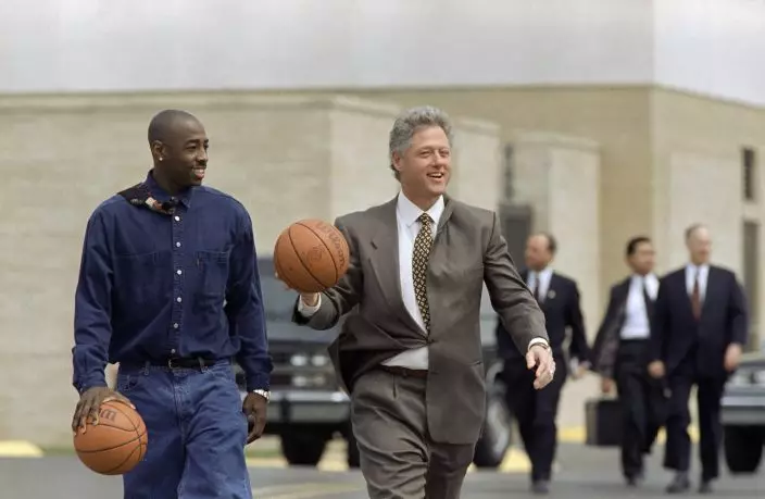 FILE - In this April 3, 1995, file photo, President Bill Clinton walks on the Arkansas State University campus with basketball player Arthur Agee during a visit to the school in Jonesboro, Arkansas. Agee, a senior at the school, was one of the stars of the movie "Hoop Dreams." The movie is the undisputed king of all sports documentaries but it was not even nominated for an Oscar -- an Academy Award flub that ranks right up there with “Citizen Kane." (AP PhotoDoug Mills, File)