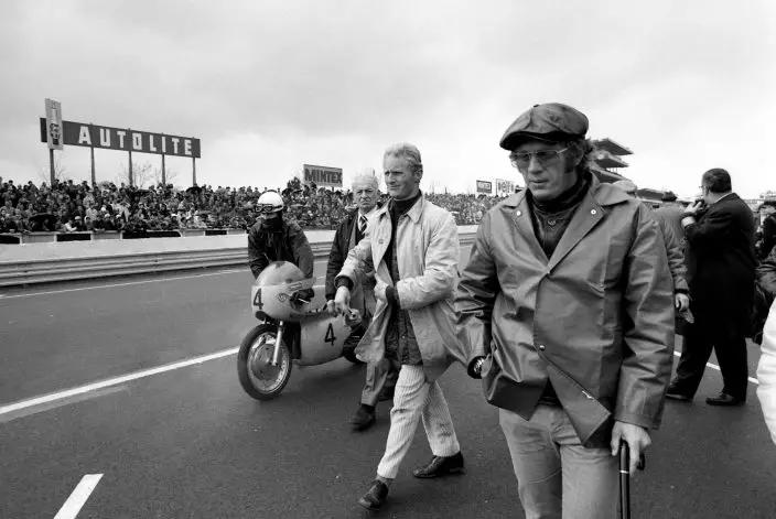 FILE - In this April 13, 1970, file photo, actor Steve McQueen, foreground, visits Le Mans in France. McQueen was at the height of his career (and an actual racer) when he decided to make the ultimate racing film centered on the 24 Hours of Le Mans. "Steve McQueen: The Man & Le Mans" is a 2015 documentary of McQueen's making of the film "Le Mans." (AP PhotoMichel Lipchitz, File)