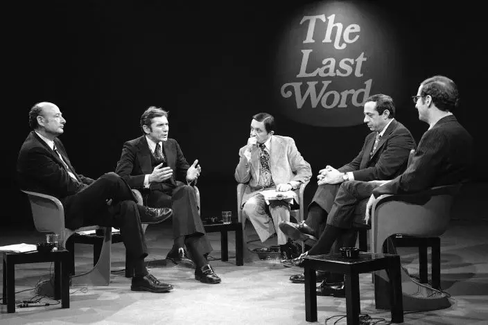 FILE - This Nov. 8, 1977 file photo shows New York mayoral Conservative candidate Barry Farber, second left, gesturing as he makes a statement during a televised debate with other mayoral candidates, in New York. Others pictured are, from left: Democratic candidate, Edward Koch; moderator Gabe Pressman; Mario Cuomo, running as a Liberal; and Republican candidate Roy Goodman. Farber died of natural causes Wednesday, May 6, 2020, at home in New York, a day after his 90th birthday, his daughter, Celia Farber, said. (AP PhotoRon Frehm, File)