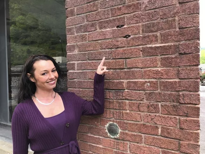In this Tuesday, May 12, 2020, photo, West Virginia Mine Wars Museum tour guide Kim McCoy points to bullet holes still visible from a gunfight between miners and detectives hired by a coal company in Matewan, W.Va. Ten people died in the Matewan Massacre on May 19, 1920. McCoy is a great niece of Sid Hatfield, the Matewan police chief who sided with the miners and was involved in the shootings. Hatfield was shot to death a year later by coal company detectives. (AP PhotoJohn Raby)