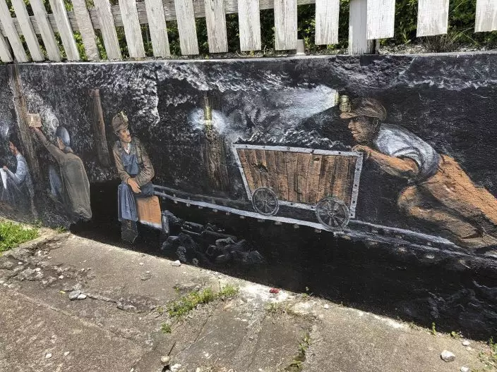In this Tuesday, May 12, 2020, photo is a mural depicting miners working in coal mines in Matewan, W.Va. On May 19, 1920, a group of miners, who were led by a local police chief, and detectives hired by a coal company to evict unionizing miners from their homes were involved in a gun battle on the street. Ten people died in the Matewan Massacre. (AP PhotoJohn Raby)