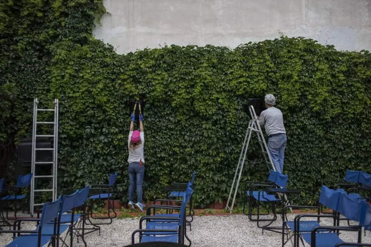 In this Friday May 29, 2020 photo Christina Tsouta, left, cuts leaves as projector operator Pavlos Lepeniotis connects the speakers at the Zephyros open-air cinema that specializes in films from past decades in Athens' central Petralona district. (AP PhotoPetros Giannakouris)