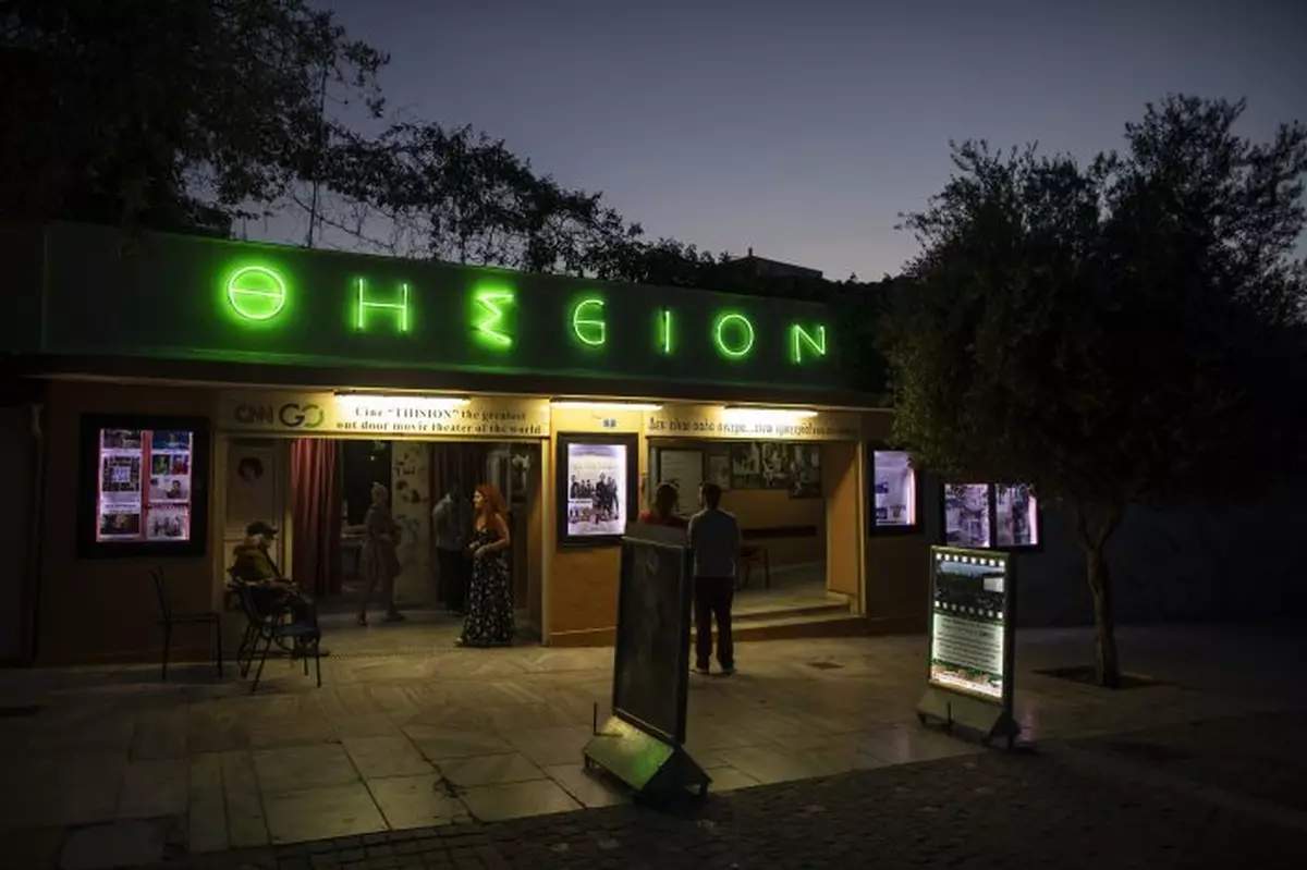 In this Thursday June 4 , 2020 photo moviegoers stand outside the entrance of the Thision outdoor summer cinema where moviegoers watch films under the ancient Acropolis. Cine Thision is one of the oldest open-air movie theaters in Athens, built in 1935. (AP PhotoPetros Giannakouris)