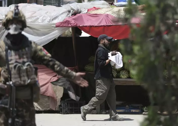FILE-in this Tuesday, May 12, 2020, photo, a security officer carries a baby after gunmen attacked a maternity hospital, in Kabul, Afghanistan. The Geneva-based international health organization Medicins Sans Frontieres MSF– also known as Doctors Without Borders Tuesday closed its operations in the Afghan capital Kabul after a horrific attack on its maternity hospital in May. (AP PhotoRahmat Gul, File)