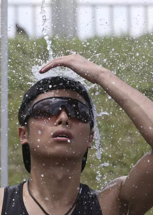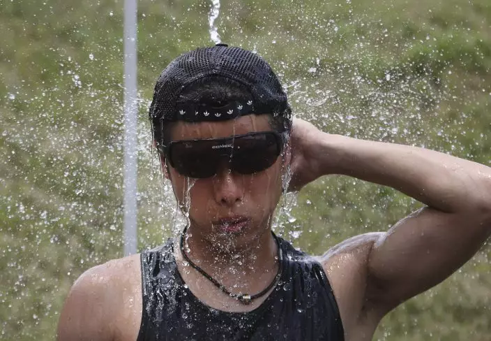 A member of the dragon boat crew cools down during the traditional Chinese dragon boat race in Taipei, Taiwan, Thursday, June 25, 2020. Dragon boat races are in remembrance of Chu Yuan, an ancient Chinese scholar-statesman, who drowned in 277 B.C. while denouncing government corruption. (AP PhotoChiang Ying-ying)