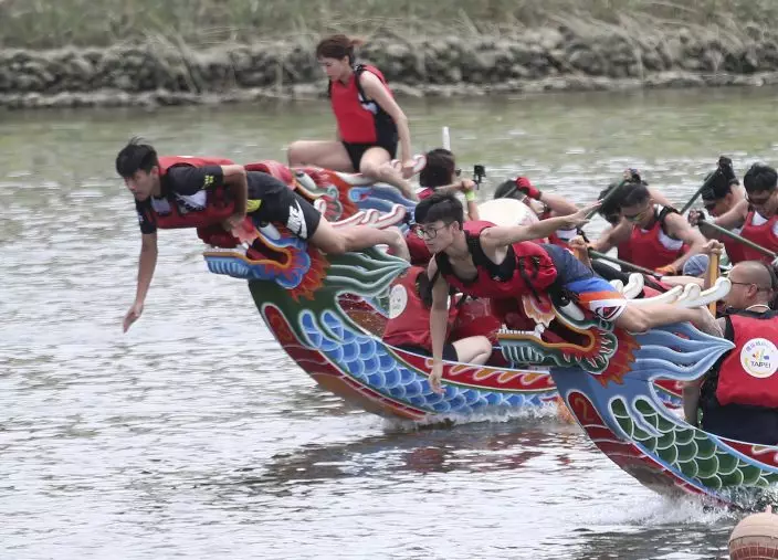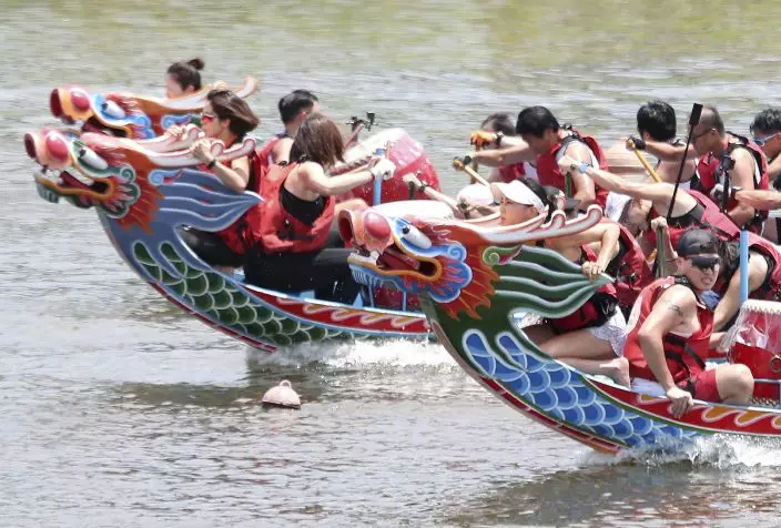 In Taipei, around 80 teams gathered at the Dajia Riverside Park to compete under the scorching sun in the two-day race, which features boats festooned with decorative dragon imagery.