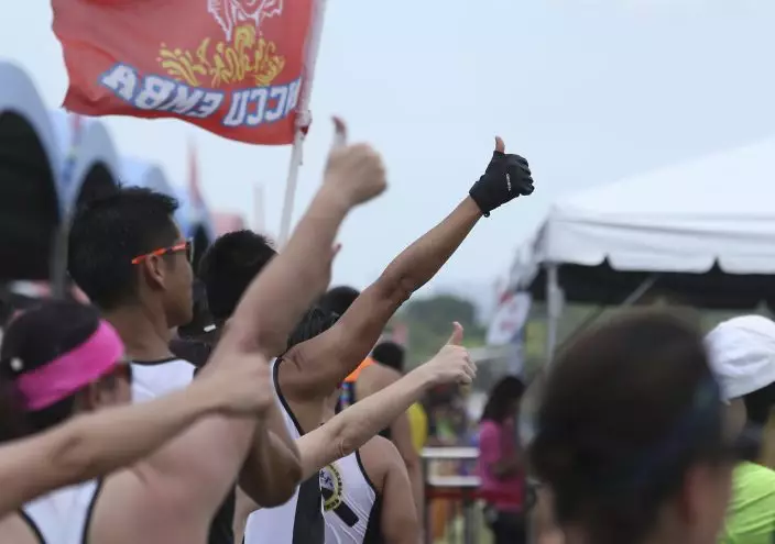 A member of the boat crews coos down during the traditional Chinese dragon boat race in Taipei, Taiwan, Thursday, June 25, 2020. Dragon boat races are in remembrance of Chu Yuan, an ancient Chinese scholar-statesman, who drowned in 277 B.C. while denouncing government corruption. (AP PhotoChiang Ying-ying)