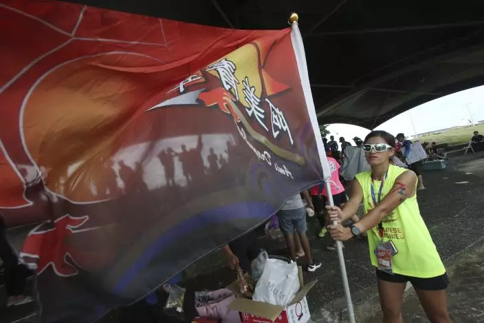 A boat crew member holds a team flag during the traditional Chinese dragon boat race in Taipei, Taiwan, Thursday, June 25, 2020. Dragon boat races are in remembrance of Chu Yuan, an ancient Chinese scholar-statesman, who drowned in 277 B.C. while denouncing government corruption. (AP PhotoChiang Ying-ying)