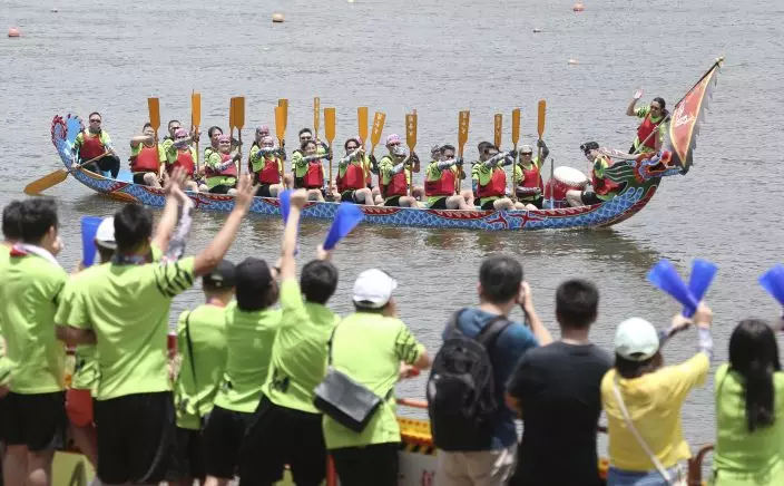 Dragon boat crew members cheer after a traditional Chinese dragon boat race in Taipei, Taiwan, Thursday, June 25, 2020. Dragon boat races are in remembrance of Chu Yuan, an ancient Chinese scholar-statesman, who drowned in 277 B.C. while denouncing government corruption. (AP PhotoChiang Ying-ying)