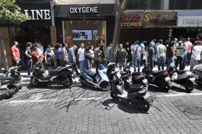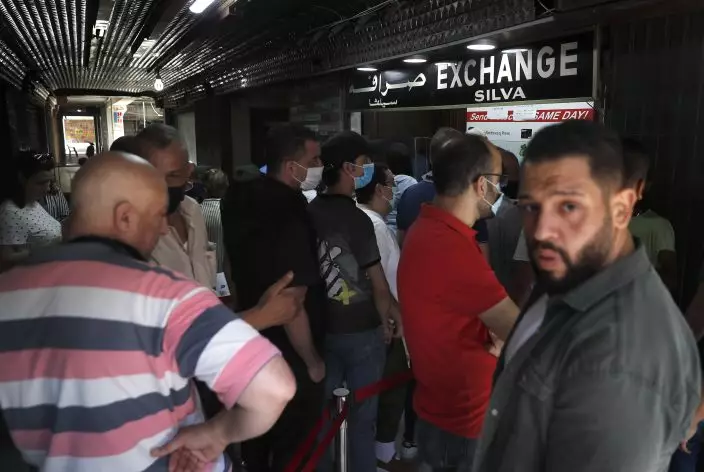 People line up outside an exchange shop to buy U.S. dollars, in Beirut, Lebanon, June 17, 2020. Lebanon's financial meltdown has thrown its people into a frantic search for dollars as the local currency's value evaporates. Long, raucous lines mass outside exchange bureaus to buy rationed dollars. Many try to rescue their dollars trapped in bank accounts frozen by the government. (AP PhotoHussein Malla)