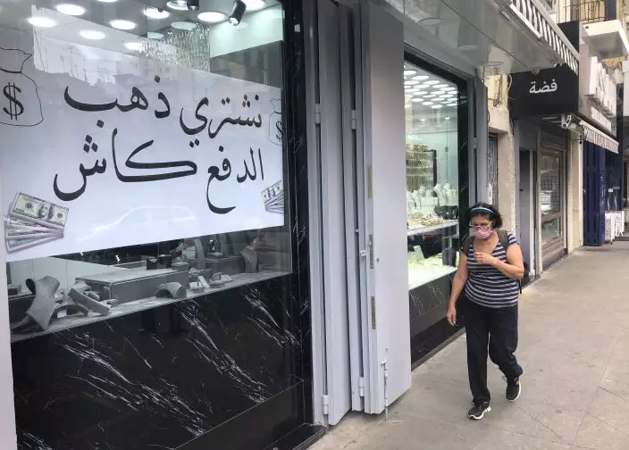 A woman passes a jewelry shop with a sign in the window in Arabic that reads, "We buy gold and pay cash in dollars," in Beirut, Lebanon, Monday, July 6, 2020. Lebanon's financial meltdown has thrown its people into a frantic search for dollars as the local currency's value evaporates. Long, raucous lines mass outside exchange bureaus to buy rationed dollars. With tens of thousands thrown into poverty, the turmoil is fueling bitterness at banks and politicians. (AP PhotoHussein Malla)
