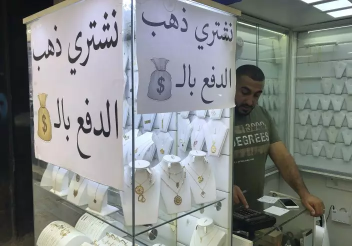 A man works in a jewelry store where an Arabic sign reads,  "We buy gold and pay in dollars," in Beirut, Lebanon, Monday, July 6, 2020. Lebanon's financial meltdown has thrown its people into a frantic search for dollars as the local currency's value evaporates. With tens of thousands thrown into poverty, the turmoil is fueling bitterness at banks and politicians. (AP PhotoHussein Malla)