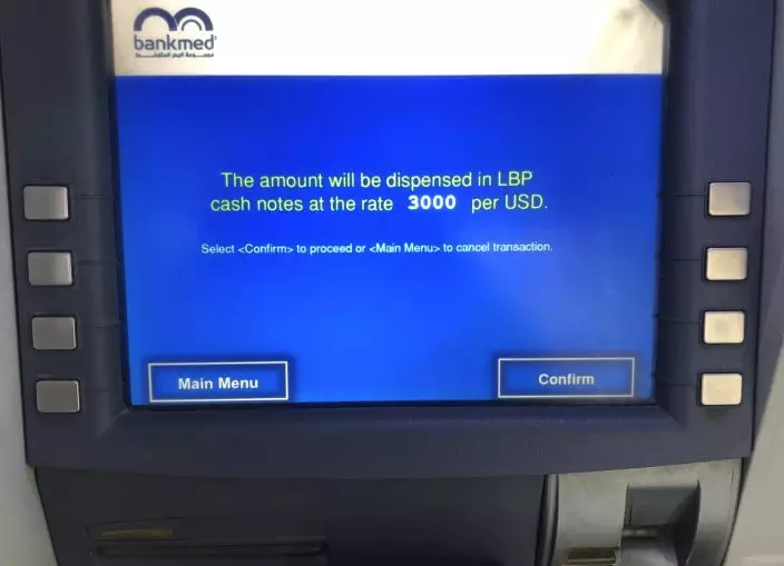 A bank ATM machine shows a message that announces that only Lebanese pounds can be dispensed even if the account is in dollars at the official bank rate, in Beirut, Lebanon, June 25, 2020. Lebanon's financial meltdown has thrown its people into a frantic search for dollars as the local currency's value evaporates. Many try to rescue their dollars trapped in bank accounts frozen by the government. Purchases of real estate have shot up as Lebanese search for places to save their wealth from spiraling exchange rates. (AP PhotoHussein Malla)