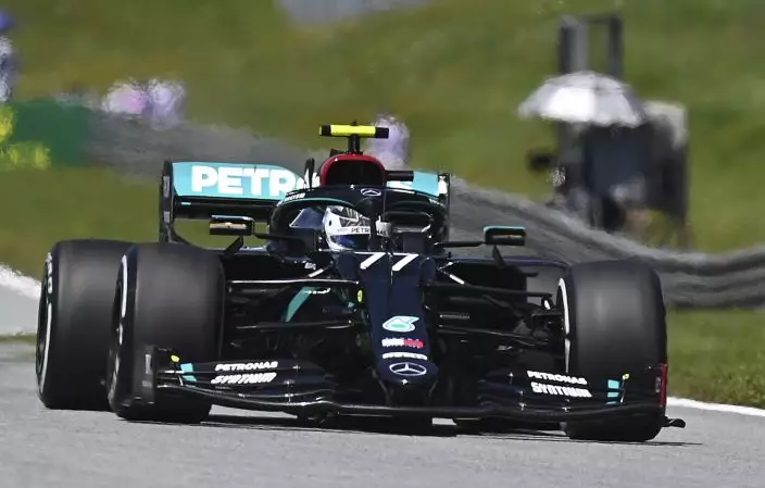 Mercedes driver Valtteri Bottas of Finland steers his car during the first practice session for the Styrian Formula One Grand Prix at the Red Bull Ring racetrack in Spielberg, Austria, Friday, July 10, 2020. The Styrian F1 Grand Prix will be held on Sunday. (Joe KlamarPool via AP)